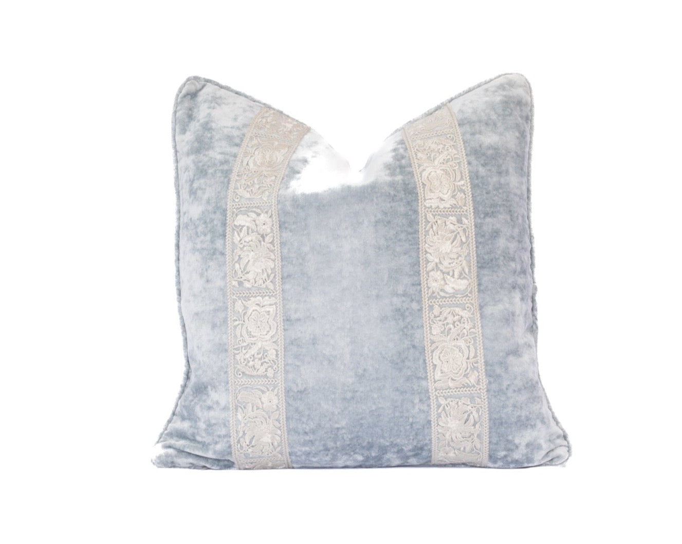 Icy Blue Velvet with Silver Gilt Trim. They are vibrant, luxurious and super soft cut velvet fabric with rich and dramatic super luxurious silver gilt trim. Feather inserts included.