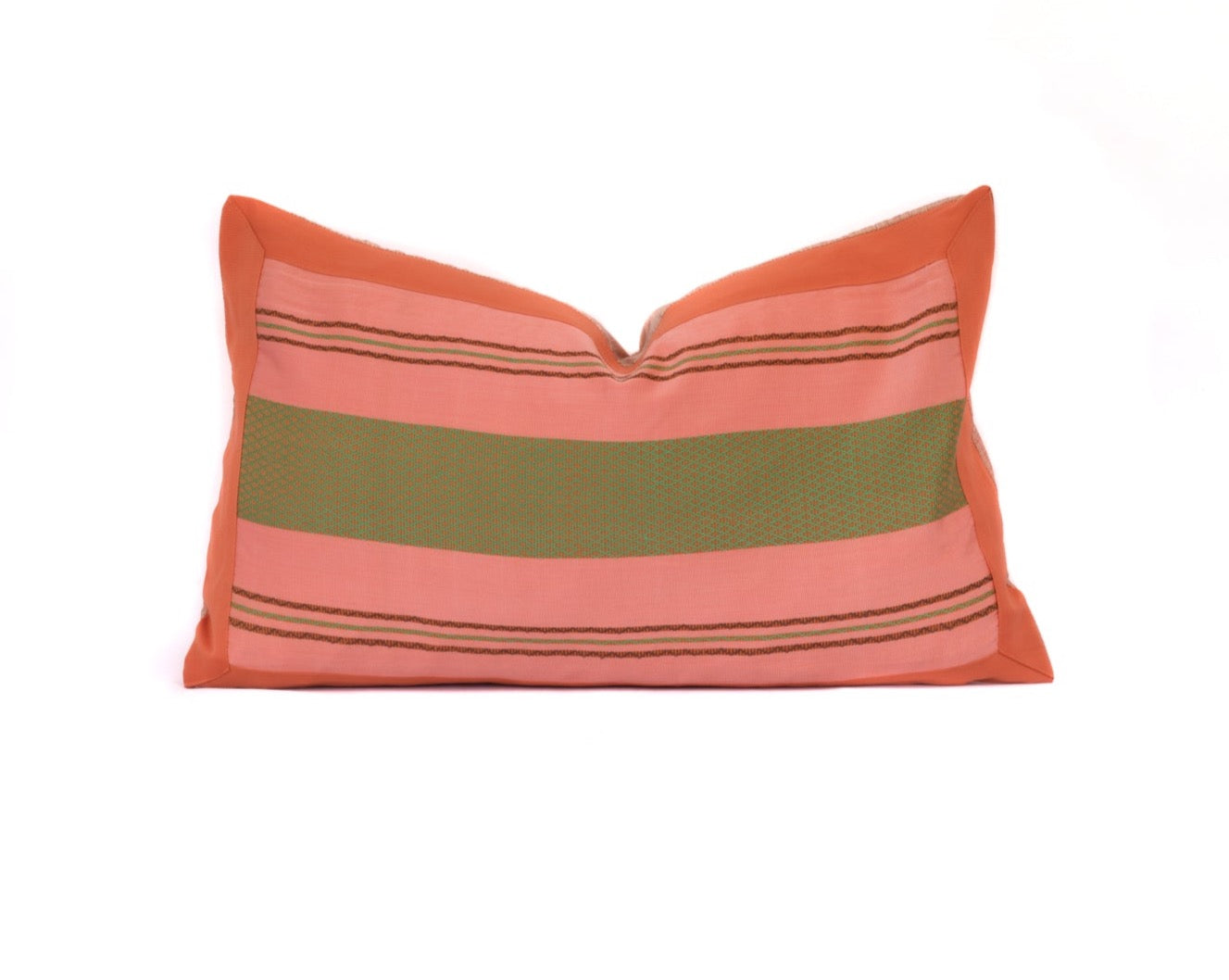 I should name this the Joseph's Technicolor Pillow. This pillow is made from a hand loomed fabric woven by the Chams. The colors and texture are so vibrant. The back fabric is a pure silk melon and red strie. The pillow inserts are feather.