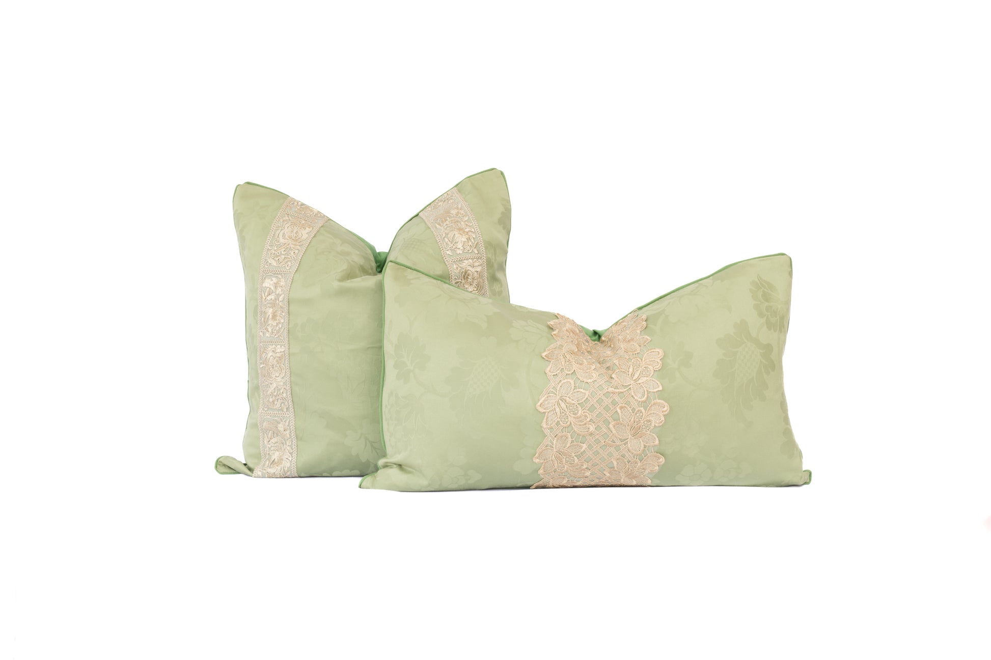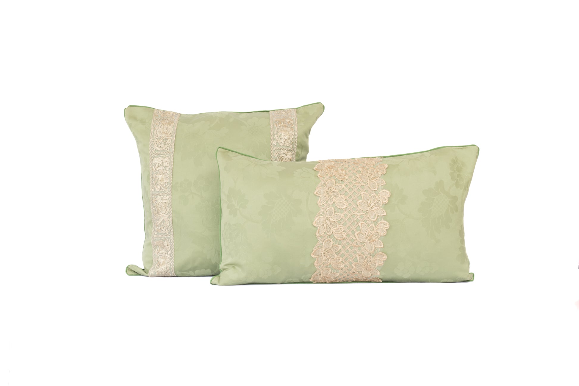 This vibrant, luxurious pillows are must have for any home! The trim is really rich and dramatic. The 100% silk backs are just as gorgeous are the woven damask. The pillow inserts are feather.