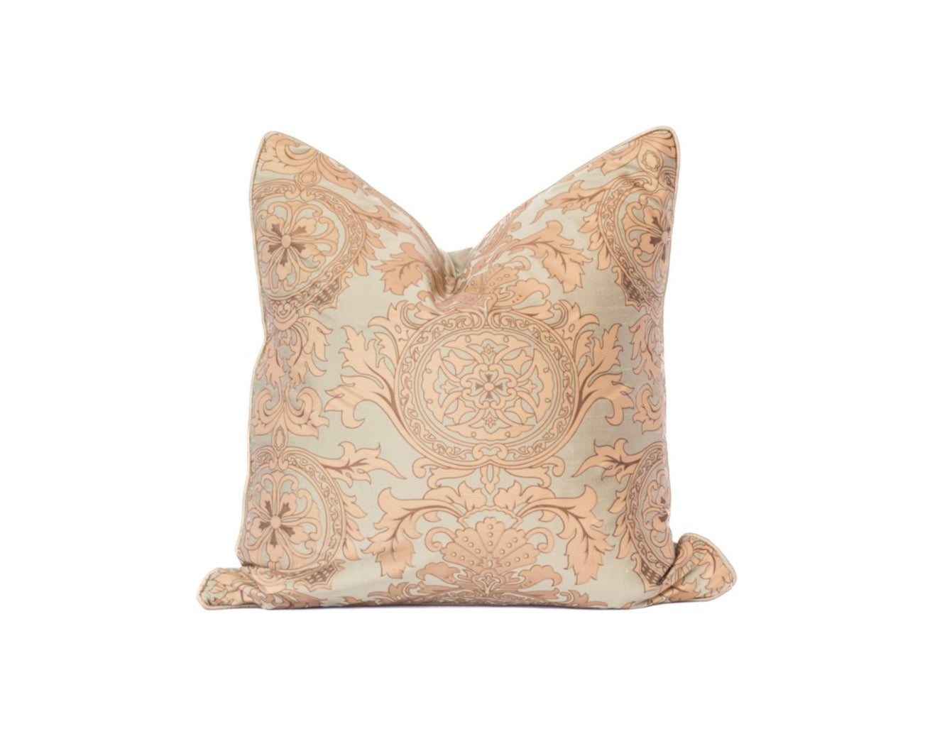 A Damask Pattern Italian Fortuny Style Silk Pillow. These pillows are gorgeous, very dramatic. The subtle and nubby silk fabric is painted in an overlaid damask design in bronze and accents of soft browns. The welts and back fabric are in a complimentary taupe/ gold nubby Thai silk. The closure is a perfectly matching hidden zipper and the pillow insert is a feather fill.
