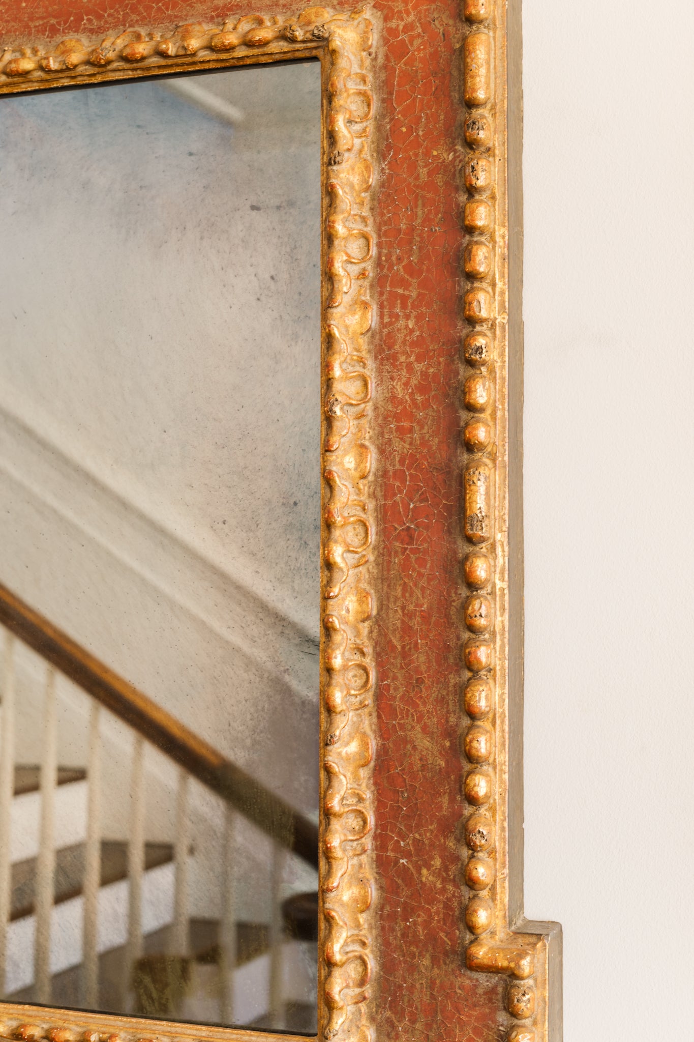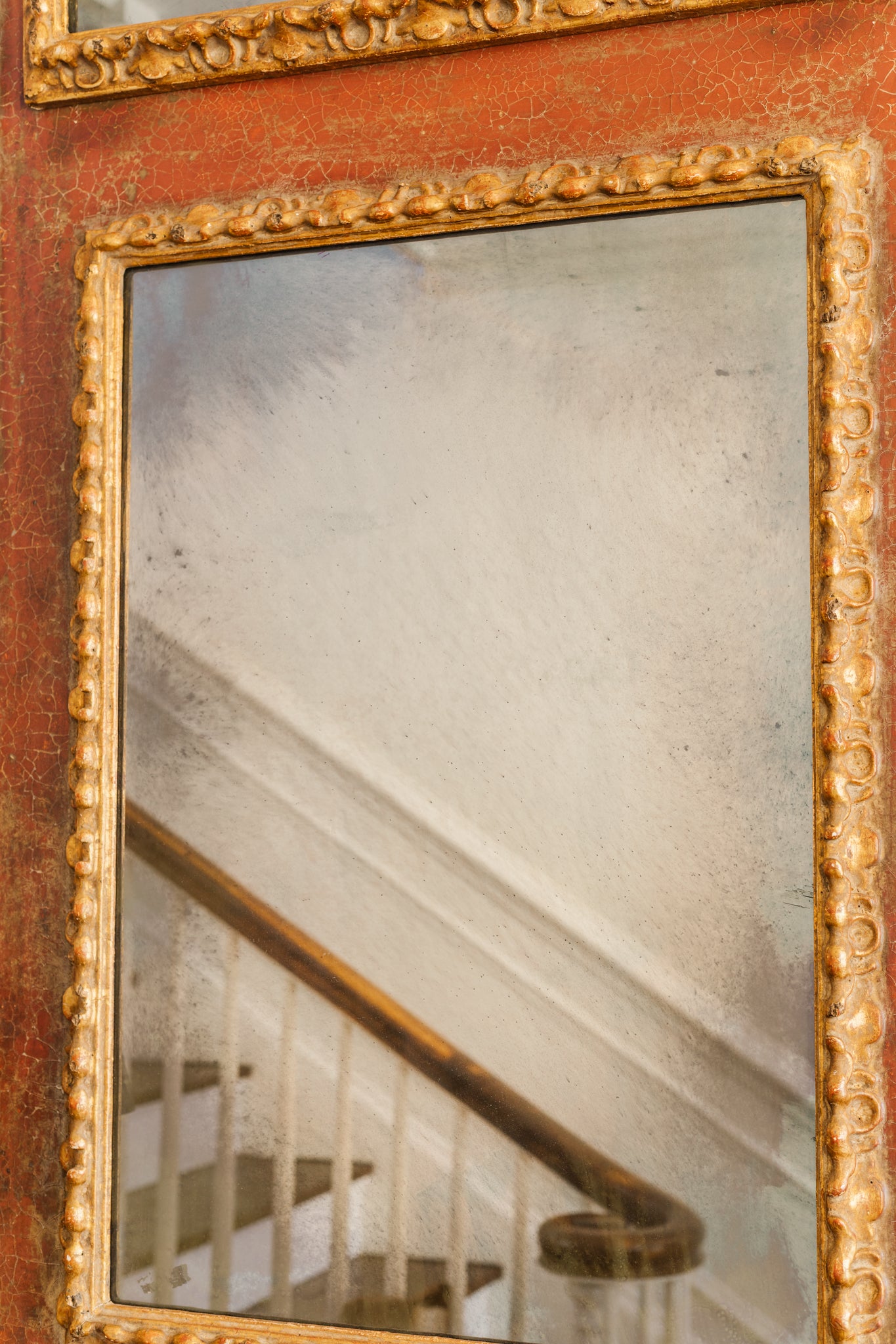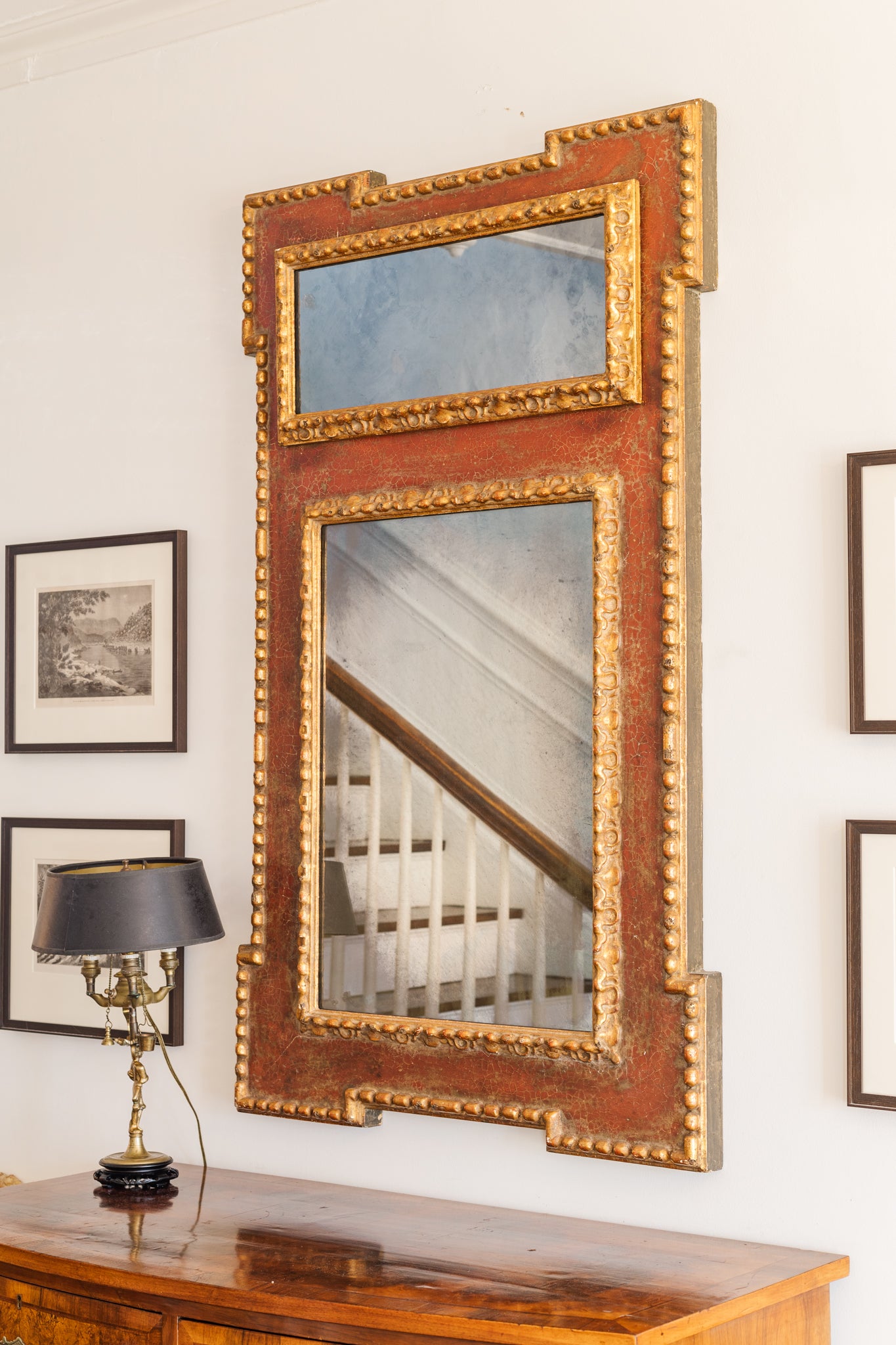 Hand-applied medium mahogany finish, smoky antiqued mirror