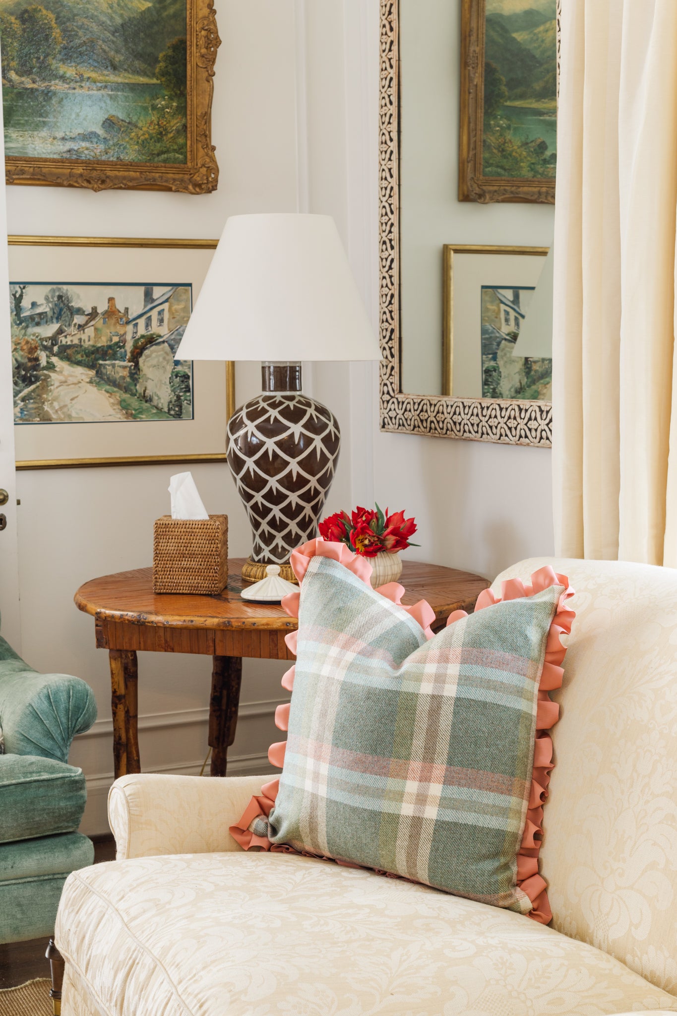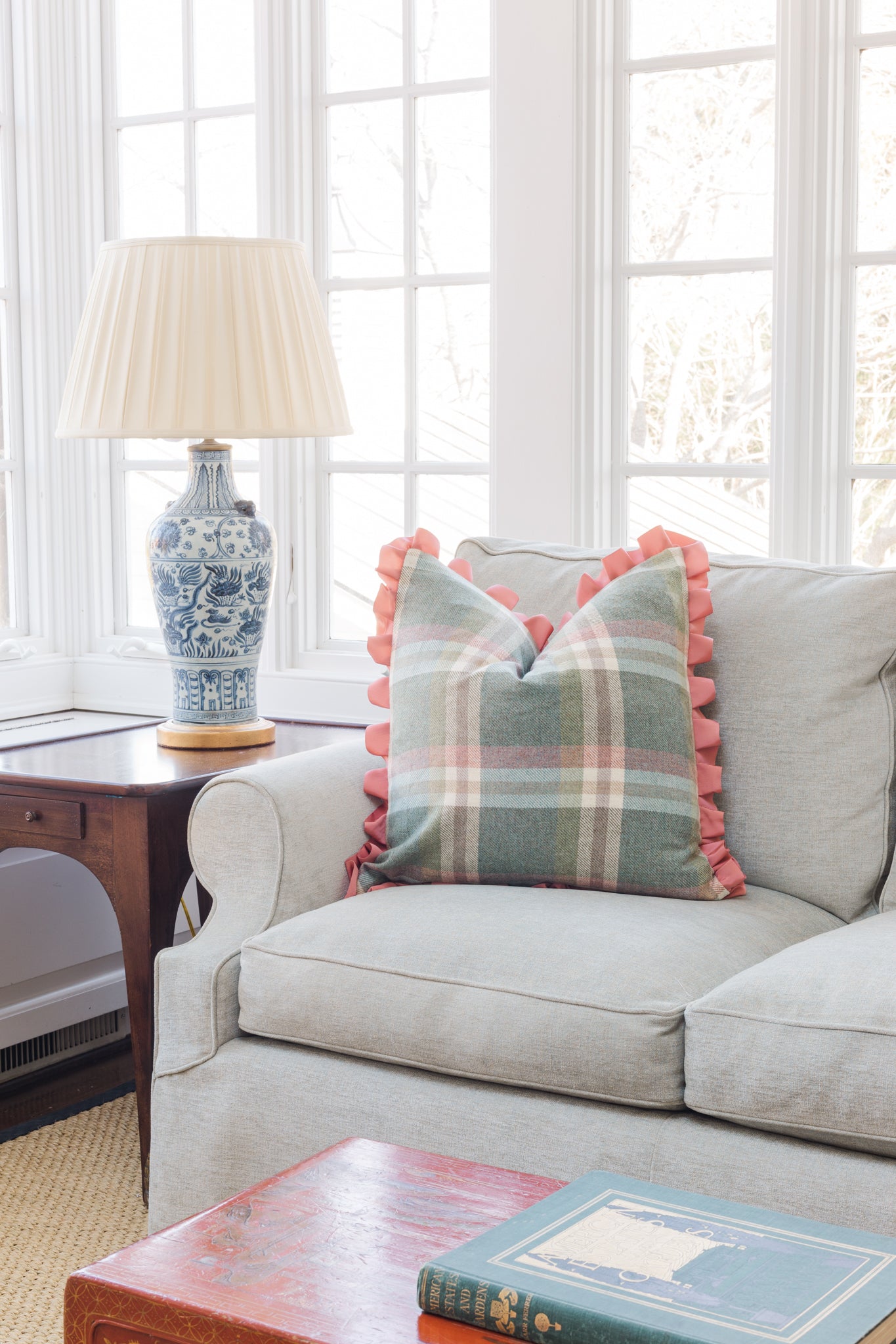 Pastel wool plaid pillow with pleated ribbon 22" square, feather insert included.