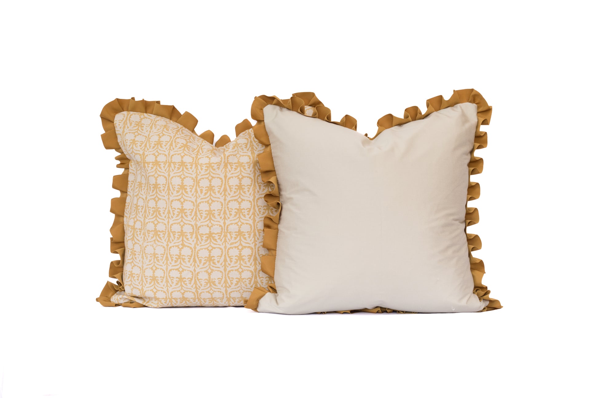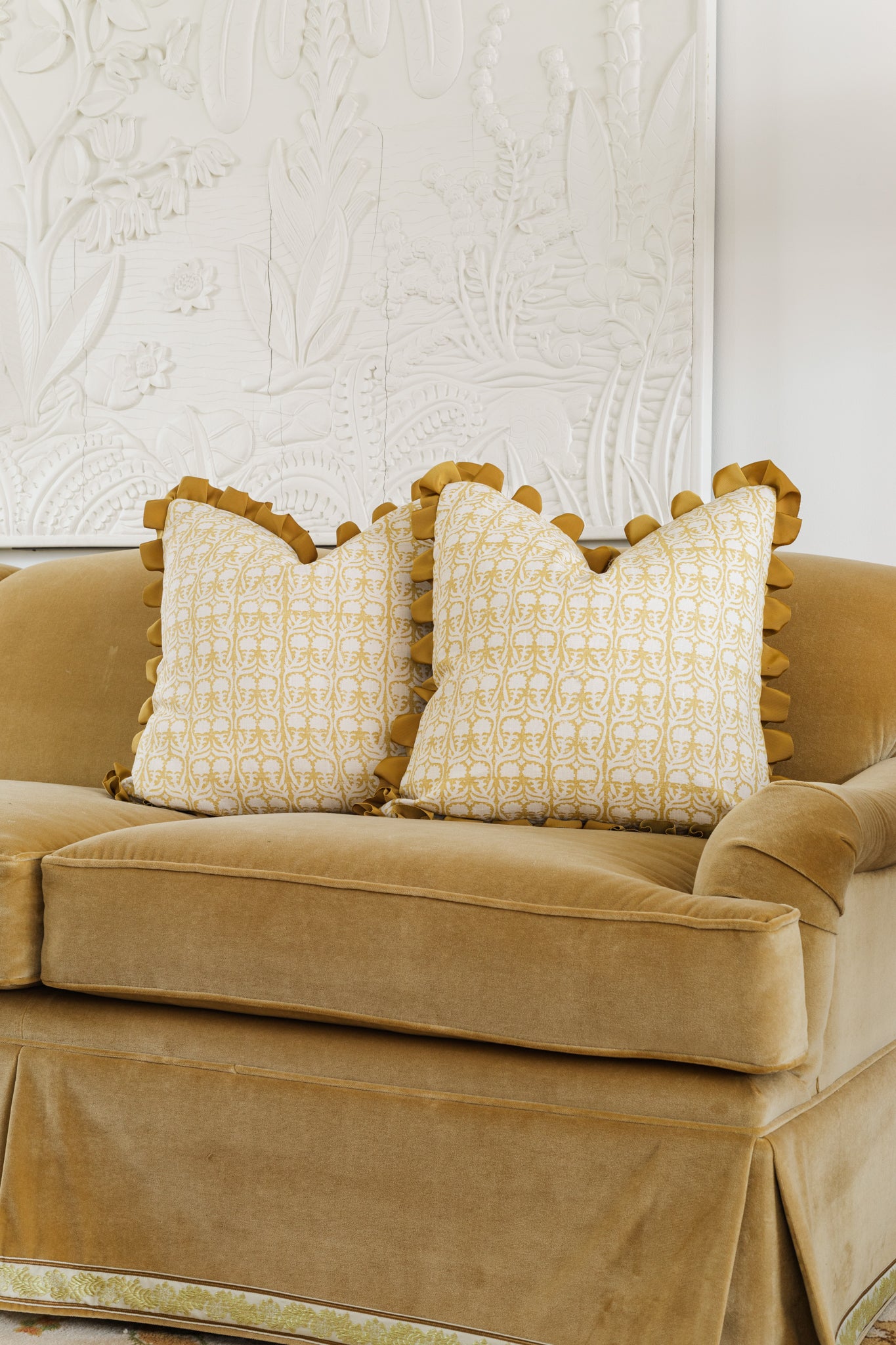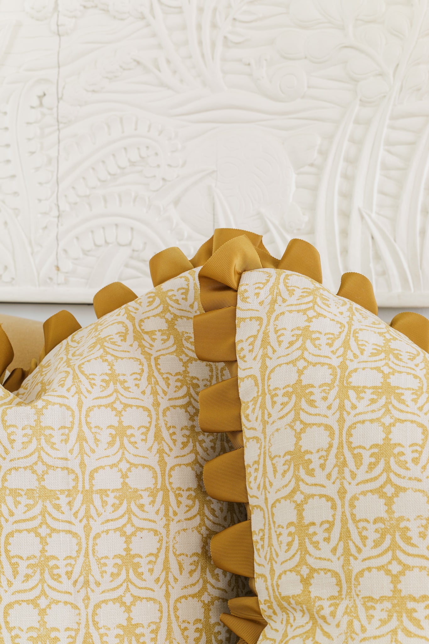 Claremont Yellow Floral Linen 22" Pillow with Solid Back and Pleated Ribbon