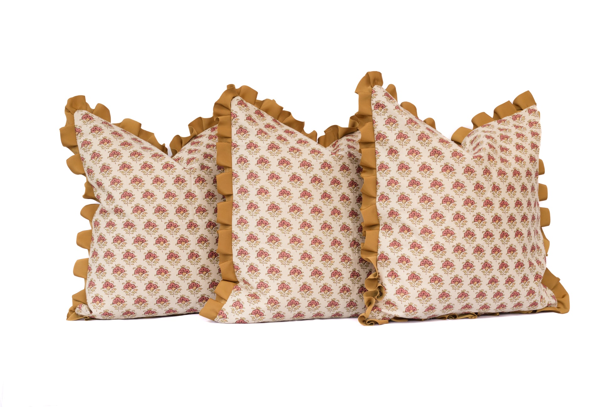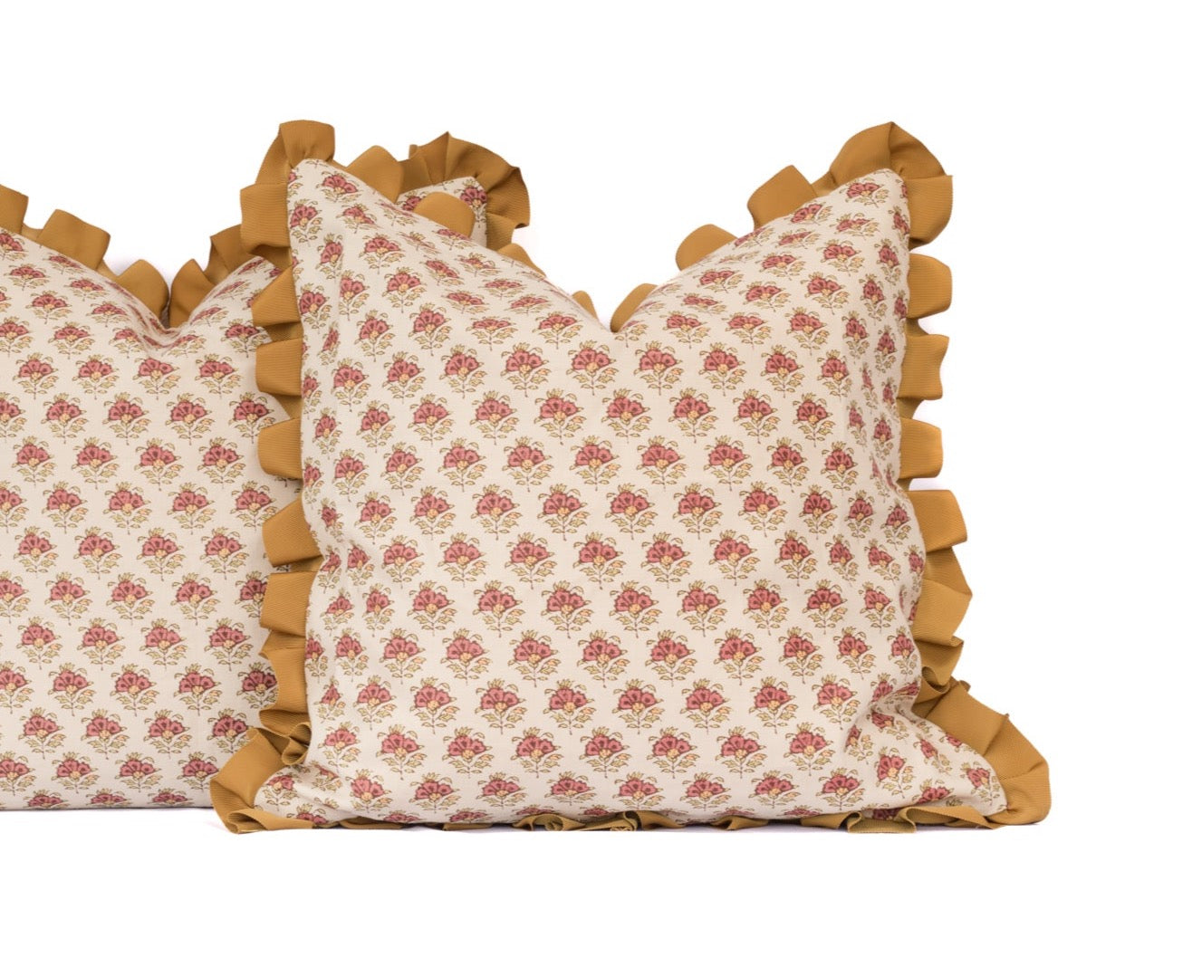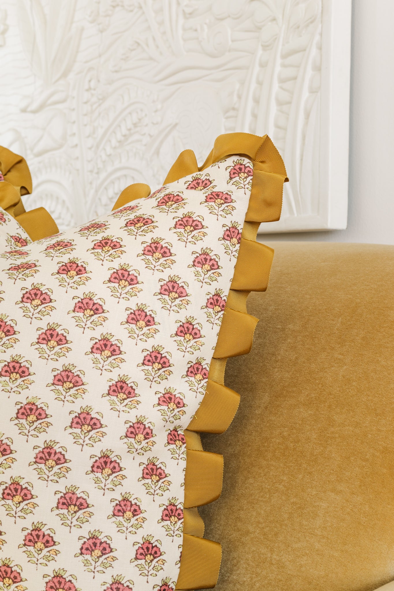 Namay Samay Guinaar Rose Pillow 22" Linen Floral Print Wool Backs Pleated Ribbon Detail, with Feather Insert