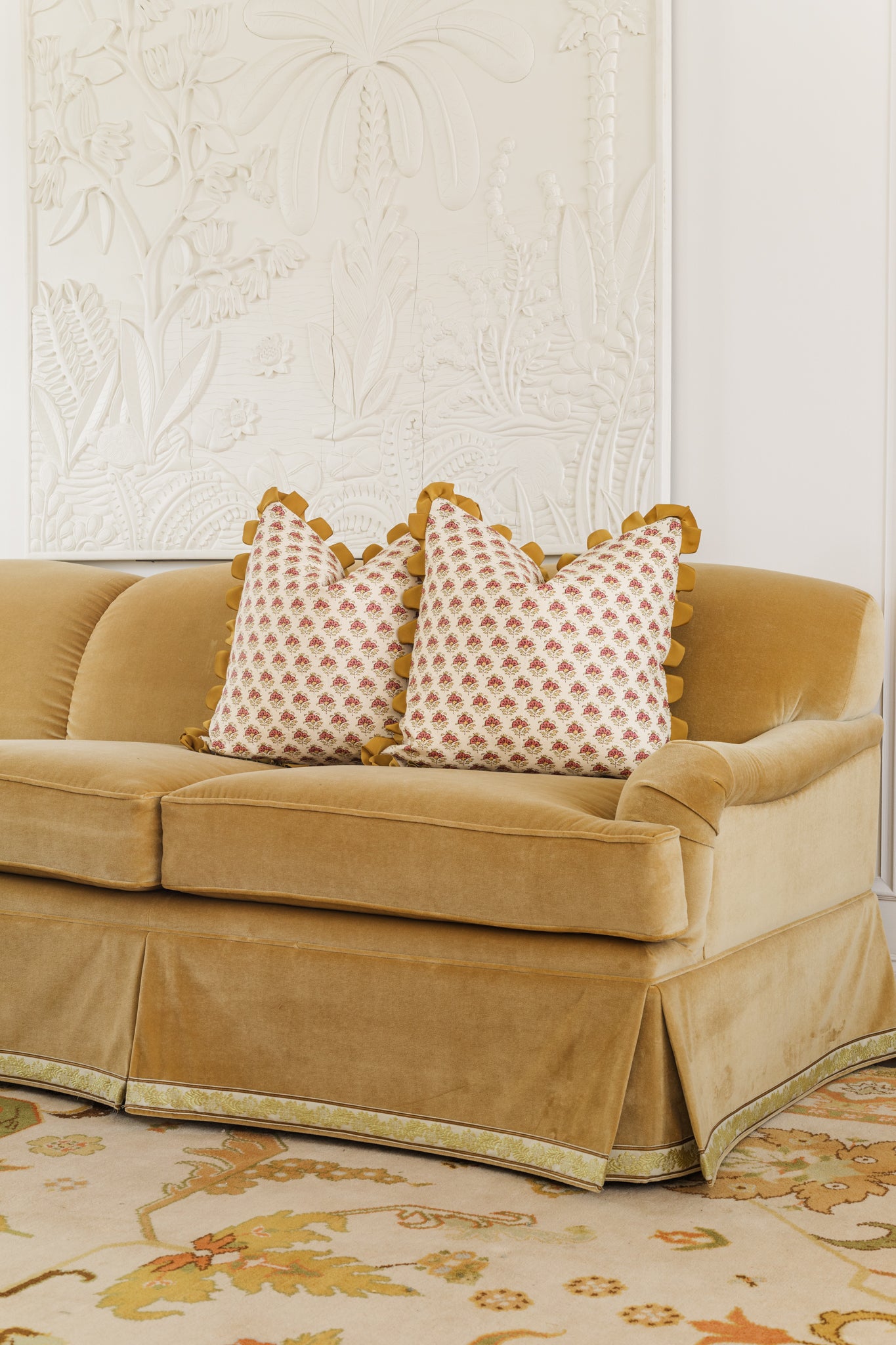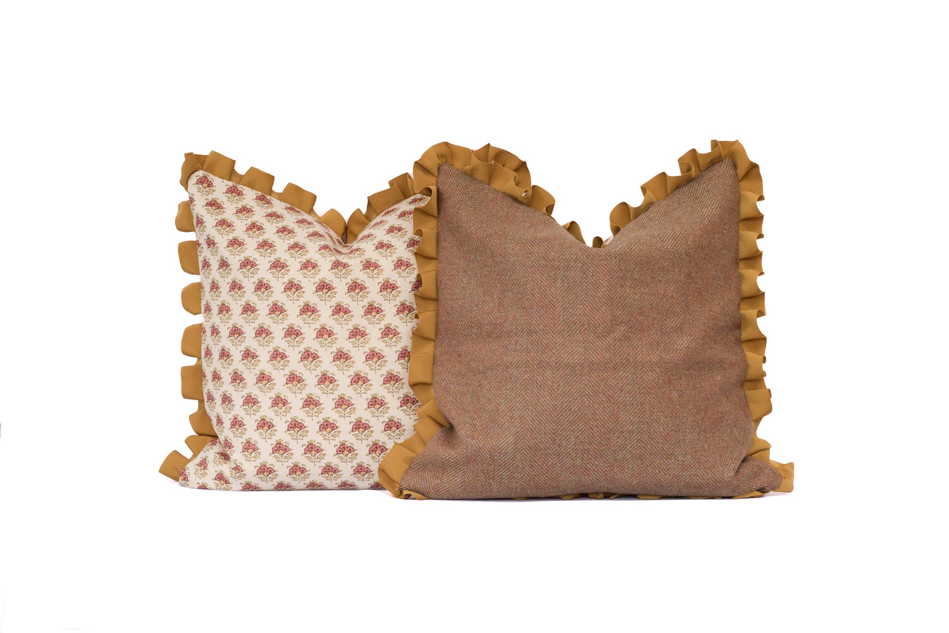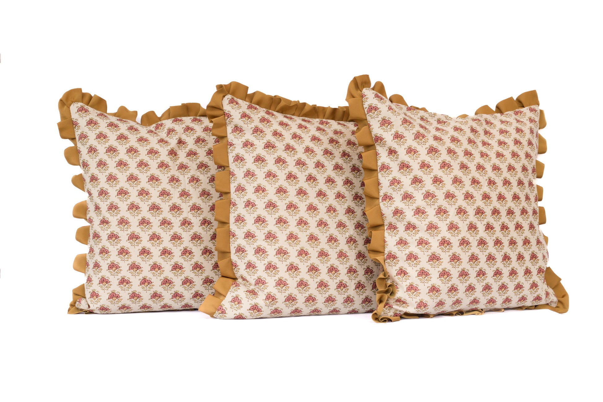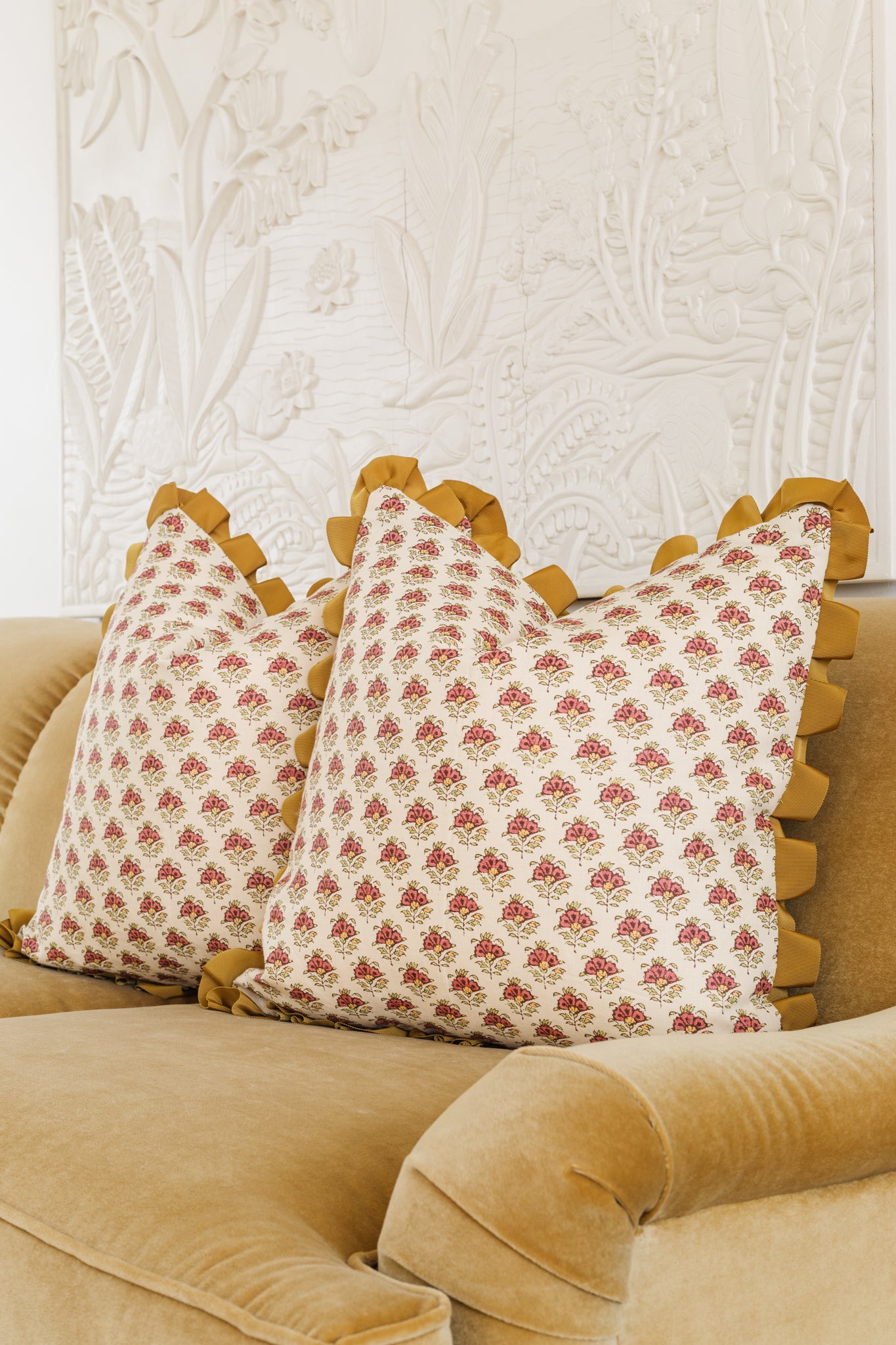 Namay Samay Guinaar Rose Pillow 22" Linen Floral Print Wool Backs Pleated Ribbon Detail, with Feather Insert