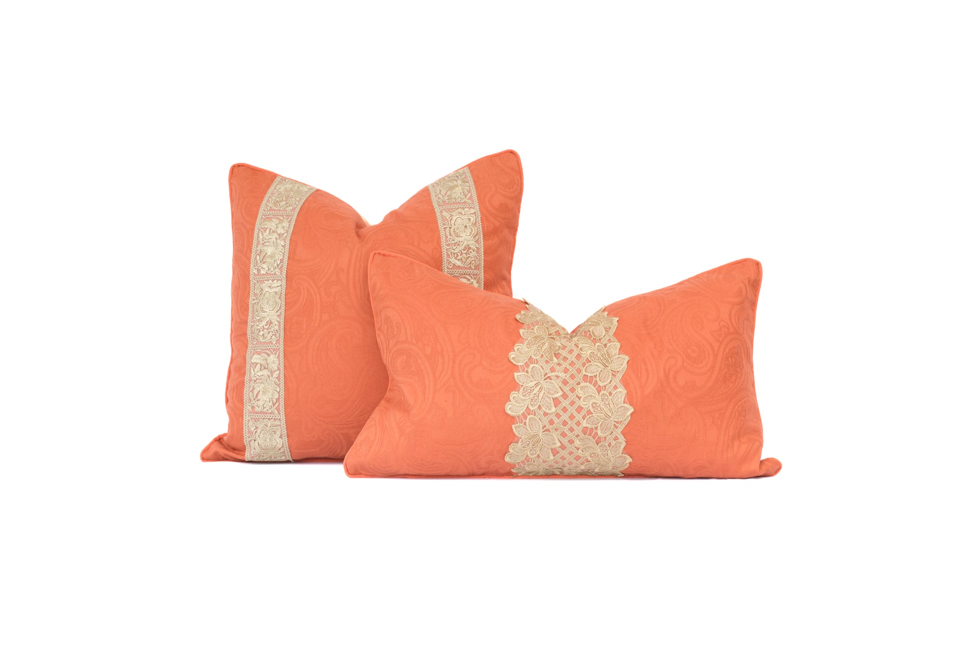 This vibrant, luxurious pillows are must have for any home! The trim is really rich and dramatic. The 100% silk backs are just as gorgeous are the woven damask. The pillow inserts are feather.