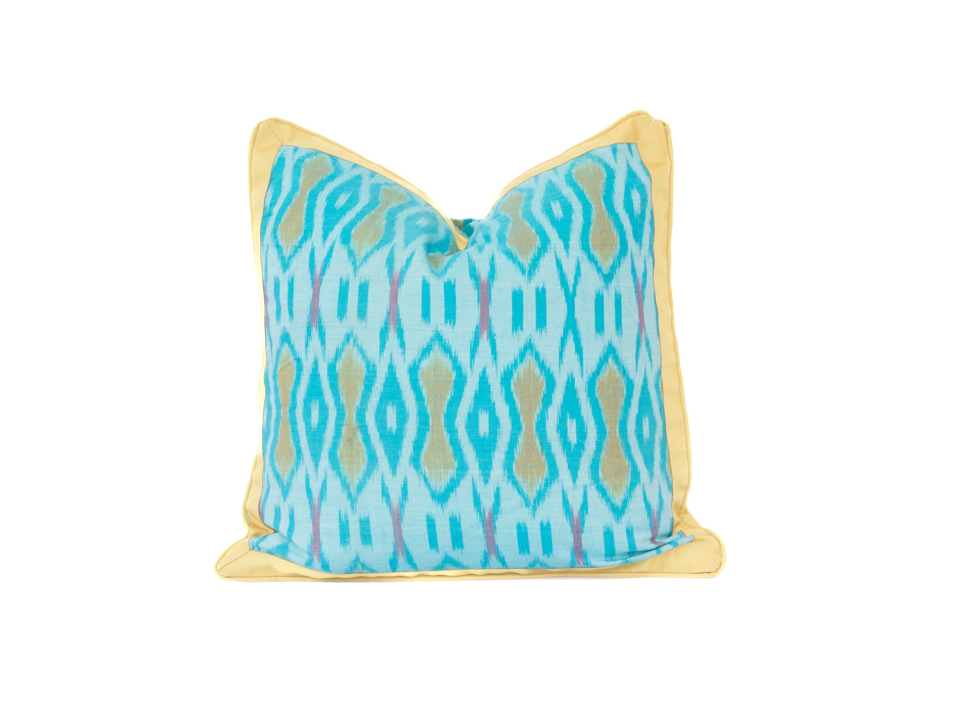 This turquoise Ikat pillow with yellow Japanese grosgrain trim border is very vibrant and will brighten any room.