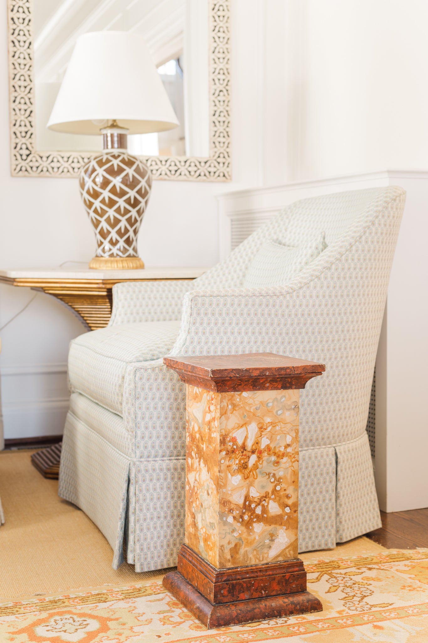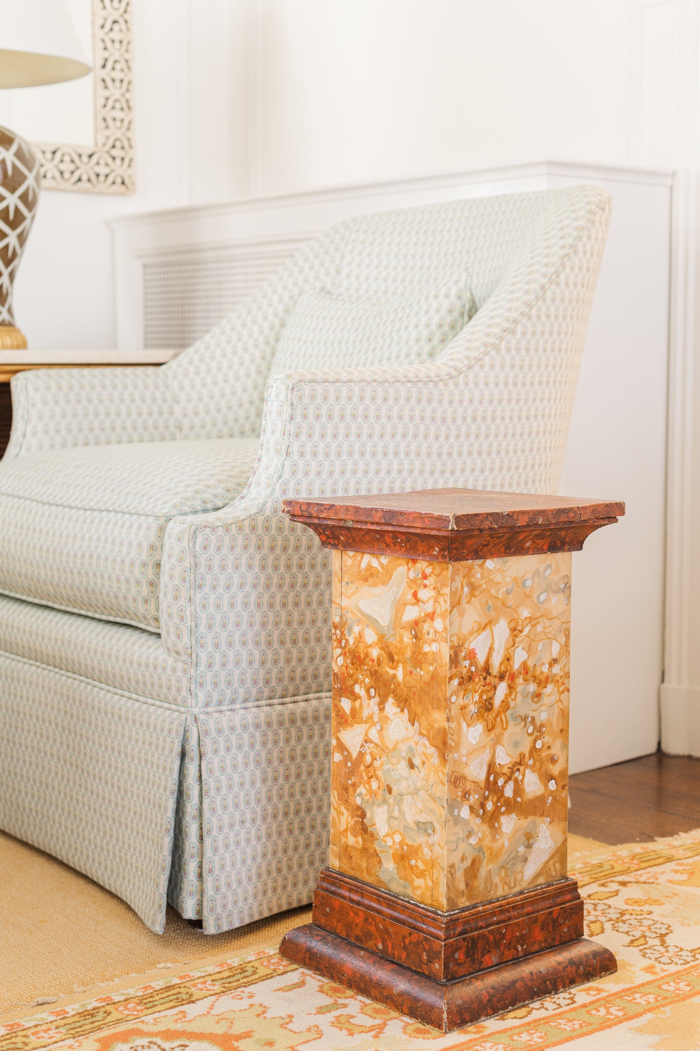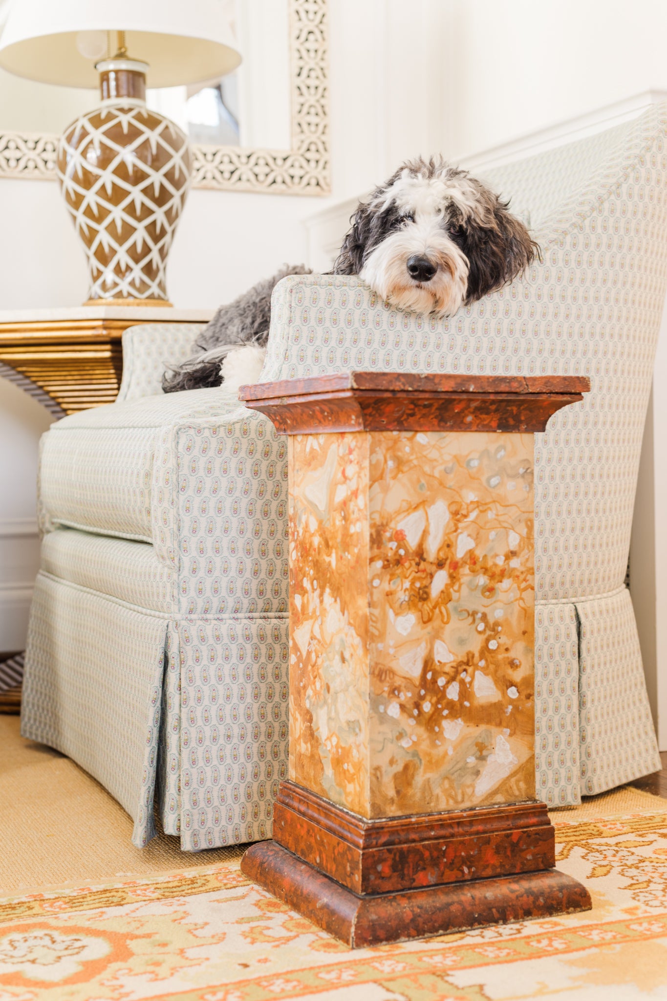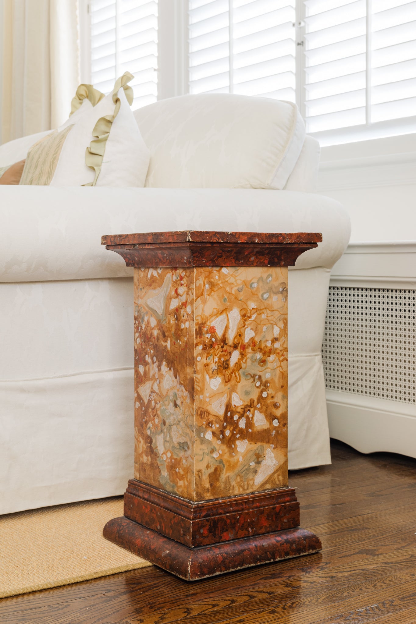 A wood pedestal drink table with a vibrant yet muted color palette with Tromp L'oeil marble in the style of Breche d'Alep. Puppy not included.