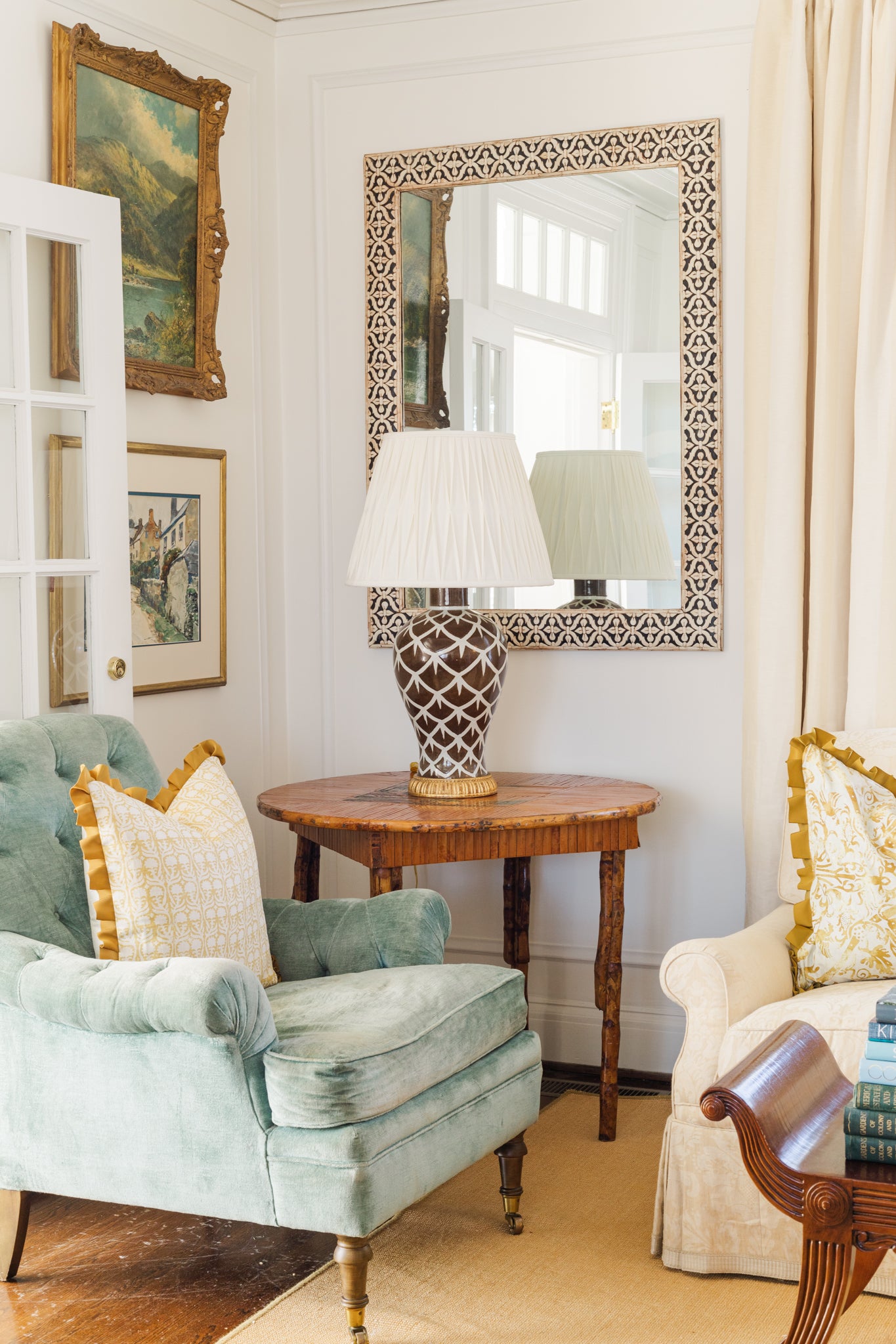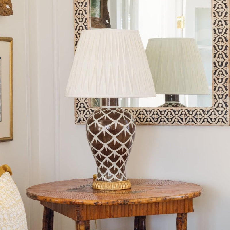 This vibrantly painted “chicken feather” design was inspired by captivating pottery from Peru, and enhances the fluid lines of this ceramic lamp.