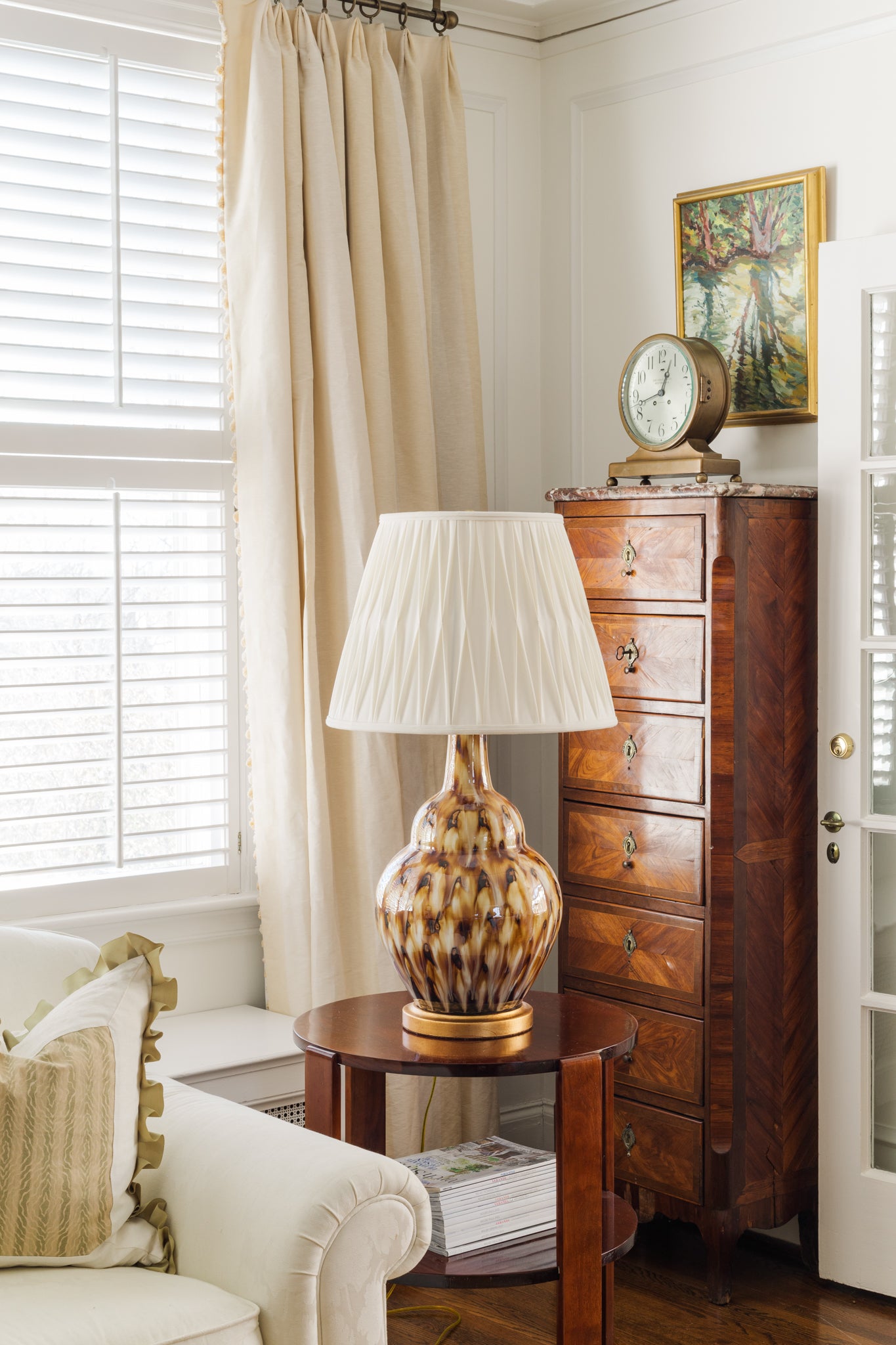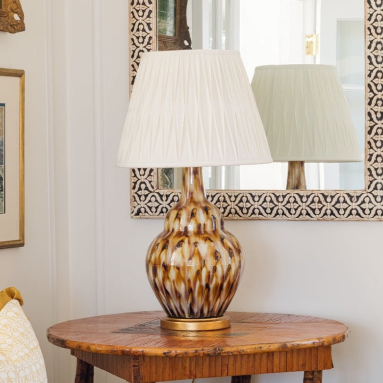 The classical silhouette of our Pheasant Feather lamp adds a graceful, subdued ambiance to any side table. The lamp’s ceramic vase is hand-painted in warm brown tones before a final glazing and firing to produce this stunning allover pattern. It is then set on a gilded wedding band base.